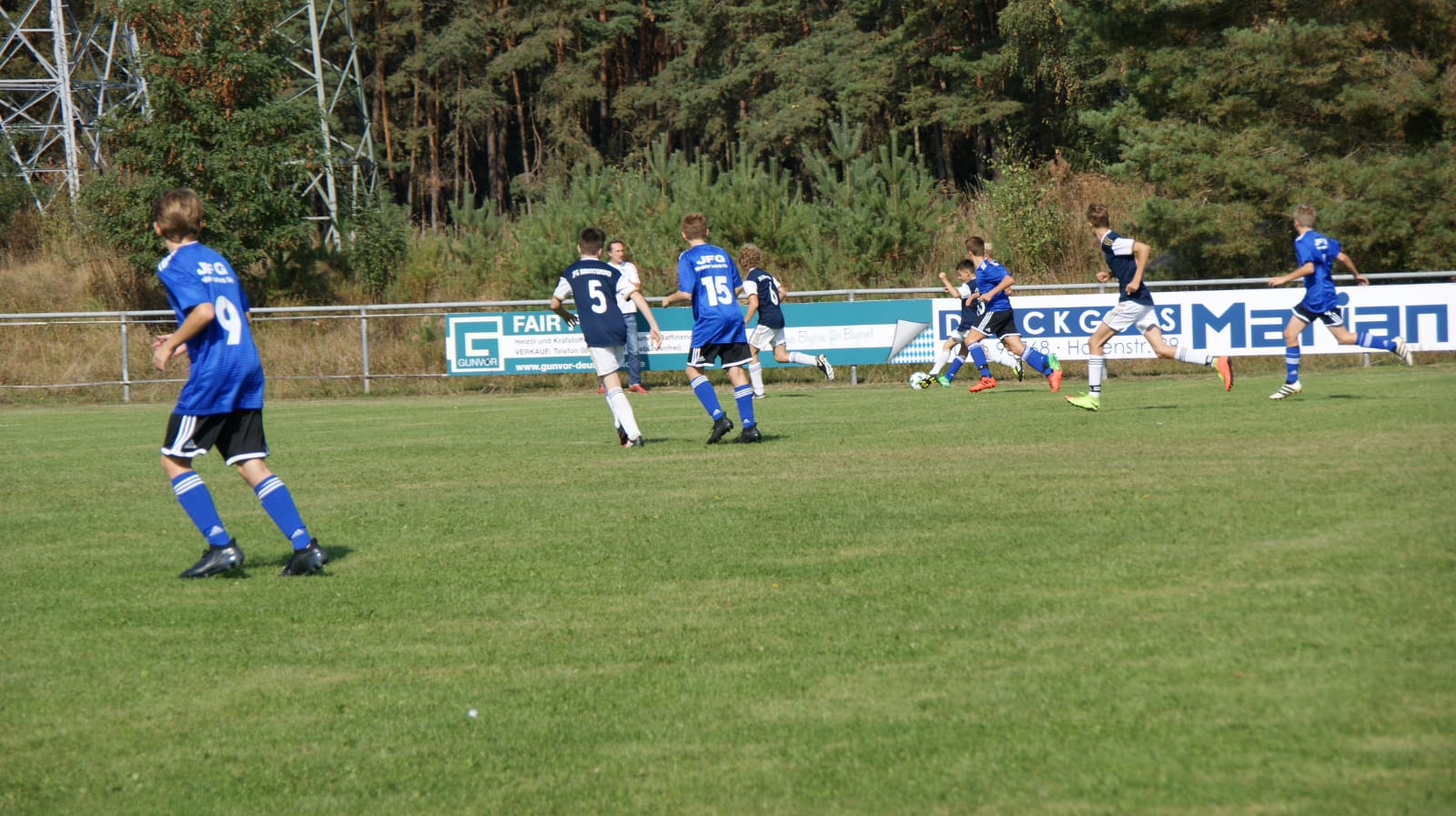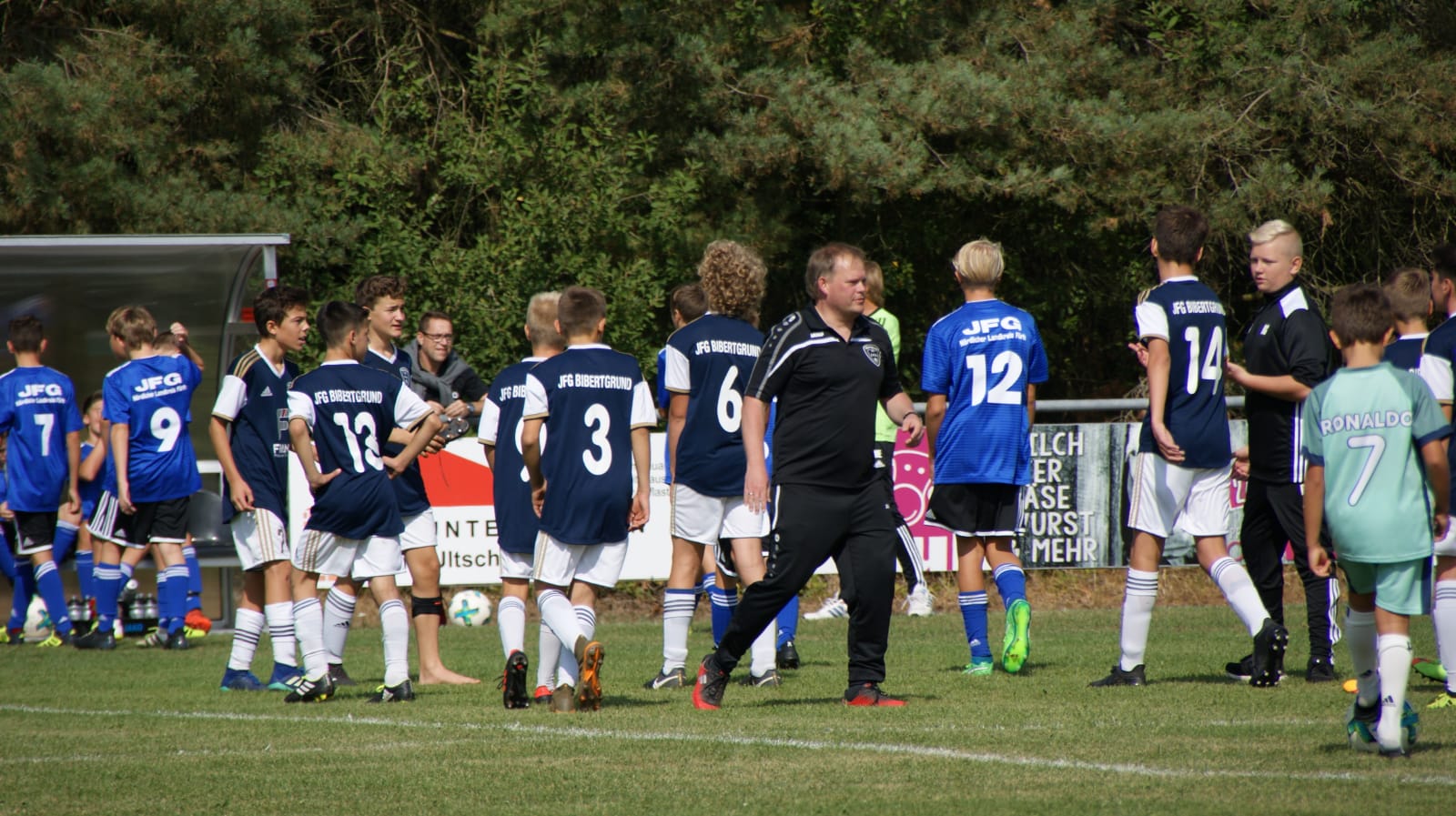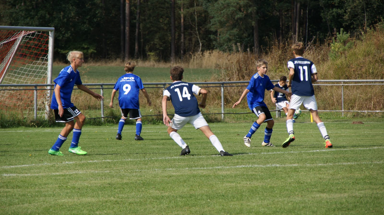Obwohl das letzte Hinrundenspiel ausfällt, ist es an der Zeit ein Resümee zu ziehen. 8 Spiele, davon 4 Siege und 4 Niederlagen. 12 Punkte, Platz 4 von 10 Mann-schaften. Besser als wir uns dies vor Saisonstart vorgestellt hatten, aber schlechter als es möglich gewesen wäre. Wir sind mit einem Kader in die Saison gestartet, der nahezu vollständig mit Spielern aus dem Jahrgang 2005 bestand. Dieser muss sich mit Spieler in der C-Jugend messen, die bereits ein Jahr älter sind (Jahrgang 2004) und sich schon auf dem Großfeld akklimatisiert haben. Die Spieler konnten diesen Altersunterschied zeitweise gut kompensieren, in manchen Spielen aber nicht über die volle Spieldauer. Das 1. Spiel konnten wir gegen die JFG Nördlichen Landkreis 2:1 gewinnen. Das erste Heimspiel verloren wir leider nach einer leidenschaftlichen 2. Halbzeit mit 0:1 gegen die SG Losaurauch/Markt Erlbach. Im nächsten Spiel gab es eine verdiente 0:3 Niederlage bei der TSC Neuendettelsau. Gerade in diesem Spiel hat man noch unsere Unerfahrenheit und fehlende körperliche Robustheit gemerkt. In beiden verlorengegangen Partien hat sich die Mannschaft jedoch „gewehrt“ und nicht aufgesteckt. Gerade solche Partien haben aber unsere Schwächen aufgezeigt an denen wir nun für die Rückrunde und vor allem für die neue Saison, in der wir dann die „Alten“ sind, arbeiten müssen. Nach den zwei Niederlagen war es um so wichtiger, wieder ein Erfolgserlebnis zu schaffen. Dies gelang der Mannschaft eindrucksvoll. Die SG Quelle III wurde mit 3:0 besiegt. Eine über 70 Minuten gelungene Vorstellung. Unser Auswärtsspiel bei der SG Cadolzburg/Ammerndorf konnten wir nach einer erheblichen Steigerung nach der Halbzeit doch noch mit 2:1 gewinnen. Beim ungefährdeten, verlustpunktfreien Spitzenreiter SVG Steinachgrund gab es eine 1:4 Niederlage. Die Mannschaft hat dabei aber alles in die Waagschale geworfen und die von uns viel beschworene positive Mentalität gezeigt. Andere Mannschaften wurden hier auch schon „zweistellig“ auf die Heimreise geschickt. Nach dieser guten Leistung erfolgte - warum auch immer - unsere mit Abstand schlechteste Mannschaftsleistung. Wir verloren verdient mit 2:6 gegen die SG Dietenhofen/Heilsbronn. Trainer, Zuschauer, Eltern und auch die Spieler konnten sich diese schlechte Leistung nicht erklären. Aber so ist Fußball, so etwas hat es immer schon gegeben und es wird wieder passieren. Im anschließenden Nachholspiel gegen die SG Baudenbach gab es unter Flutlicht einen 5:0 Erfolg. Dieser war verdient, aber nicht mit Glanz umspült. Wir haben in der Hinrunde viel Positives gesehen. Die Defensive steht gut, das Mittelfeld ist bemüht, der Angriff muss aber noch zielstrebiger werden. Die Jungs ziehen im Training gut mit, die konditionelle Basis stimmt bei den meisten.